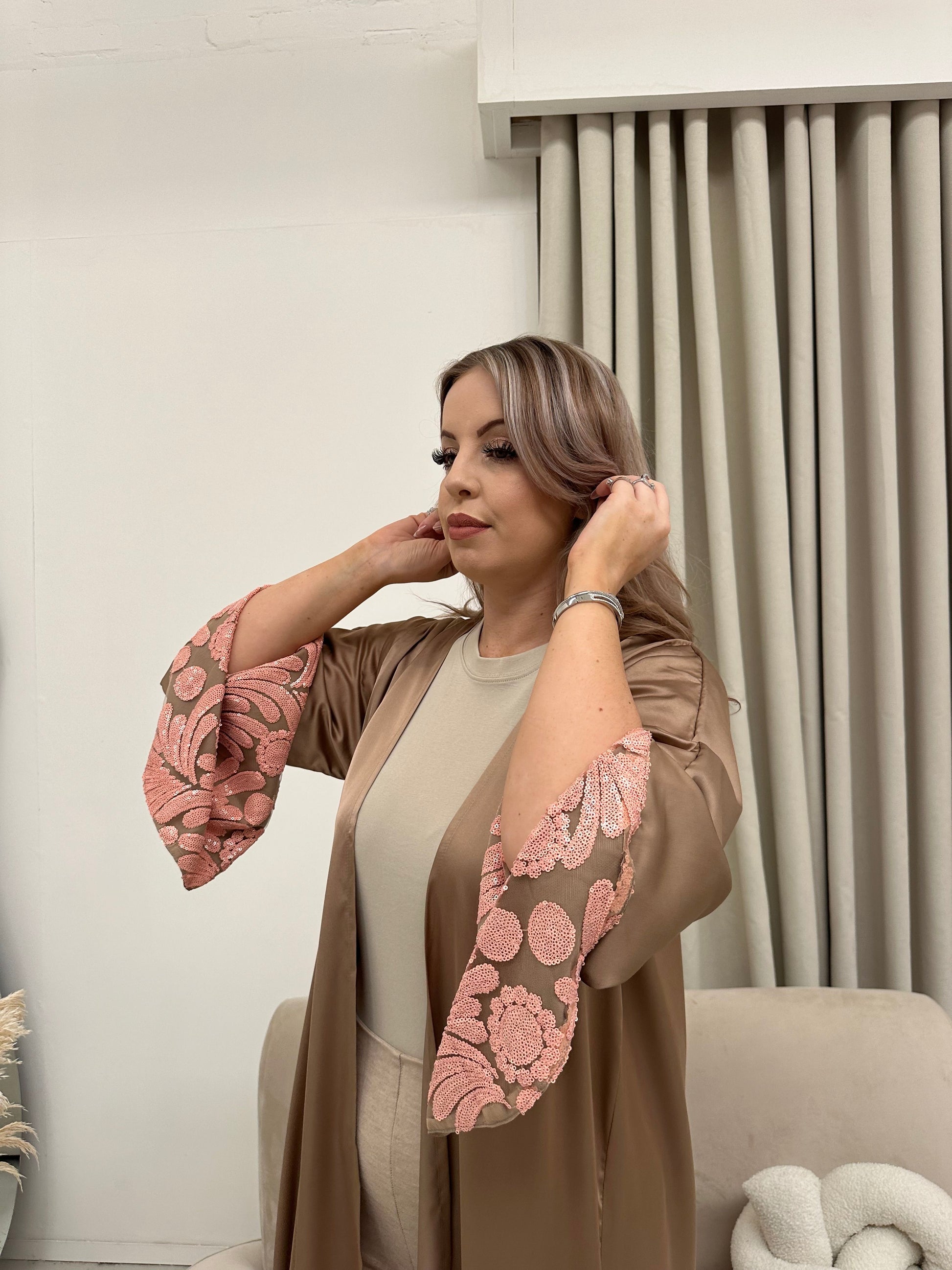 Elevate your style with the effortless elegance of The Opulence Beige. This straight-cut open abaya in a luxurious sa...