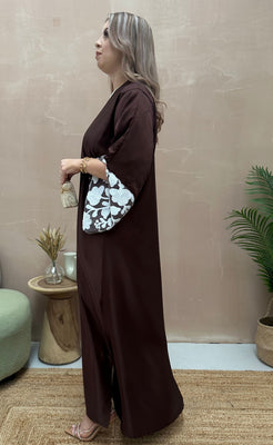 Indulge in the epitome of elegance with "The Opulence Brown" - a straight cut open abaya that radiates refined sophis...